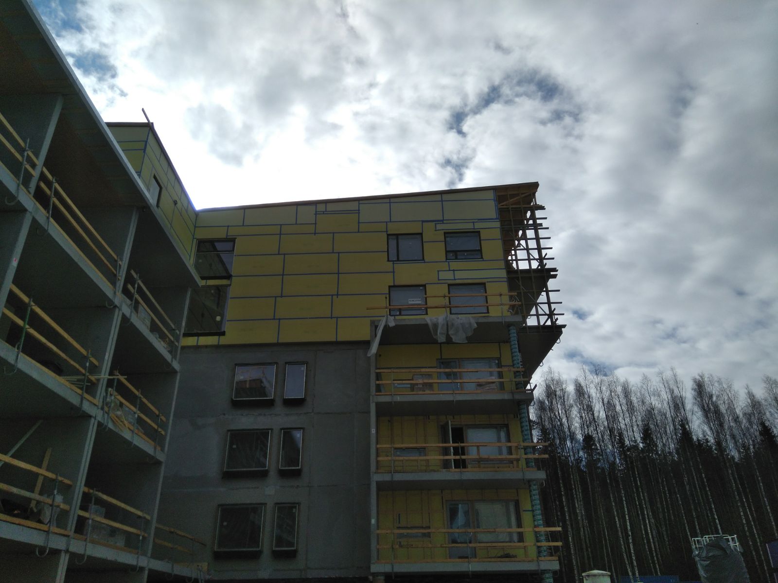 Julkisivuelementtien rakentaminen ja asentaminen, vesikatto, ikkuna- ja parvekeovien asentaminen, parvekepanelointi